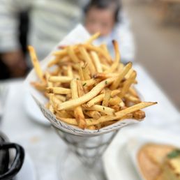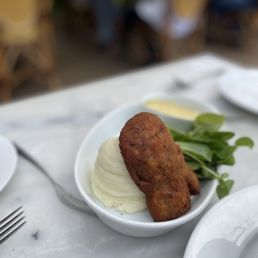 I enjoyed a delicious Saturday Lunch at Bistro Jeanty with my wife, and 4 of our dear friends during a wonderful day of wine tasting in Yountville. I wish we could have tried everything on the menu, but alas! There was just too much! My wife and I started the meal by sharing the Quenelles de Brochet - Pike dumplings with lobster sauce. They were simply marvelous! My most sincere apologies for abstaining from sharing a photo of these delectable pillows of flavor, but they were gobbled up before I remembered to take a pic. My wife ordered the Moules à la Normande - Mussels, steamed in cider with crème fraiche & grilled bread, and she loved them. I had a bite, and they were some of the best mussels I have ever had. I enjoyed the Entrecôte Frites - Wagyu flat iron steak with fries & béarnaise sauce, medium rare of course. I could not have been more delighted. The beef was tender, and the fries were fried to perfection. Our server was kind, attentive, and very quick to help us with everything. I wish I could remember his name because I would love to be in his section the next time i'm there. And there for sure will be a next time. As far as the ambiance, for lunch, it was pretty nice! I have been to Paris once, and I can honestly say it looks very much like a bistro on the Champs-Élysées. The only thing that I would complain about is our table, which was right next to the service station, where servers went to retrieve the food from the kitchen. I was constantly brushed up against by servers heading over there. I wish we could have moved the table a foot away from it, but I still give this place cinq étoiles!